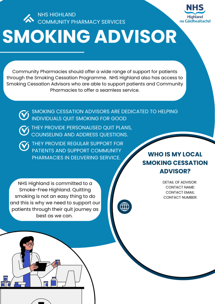 NHS Highland has Smoking Cessation Advisors that support patients and Community Pharmacies with Smoking Cessation. Each advisor has a region with which they cover and these are stated in the document below: